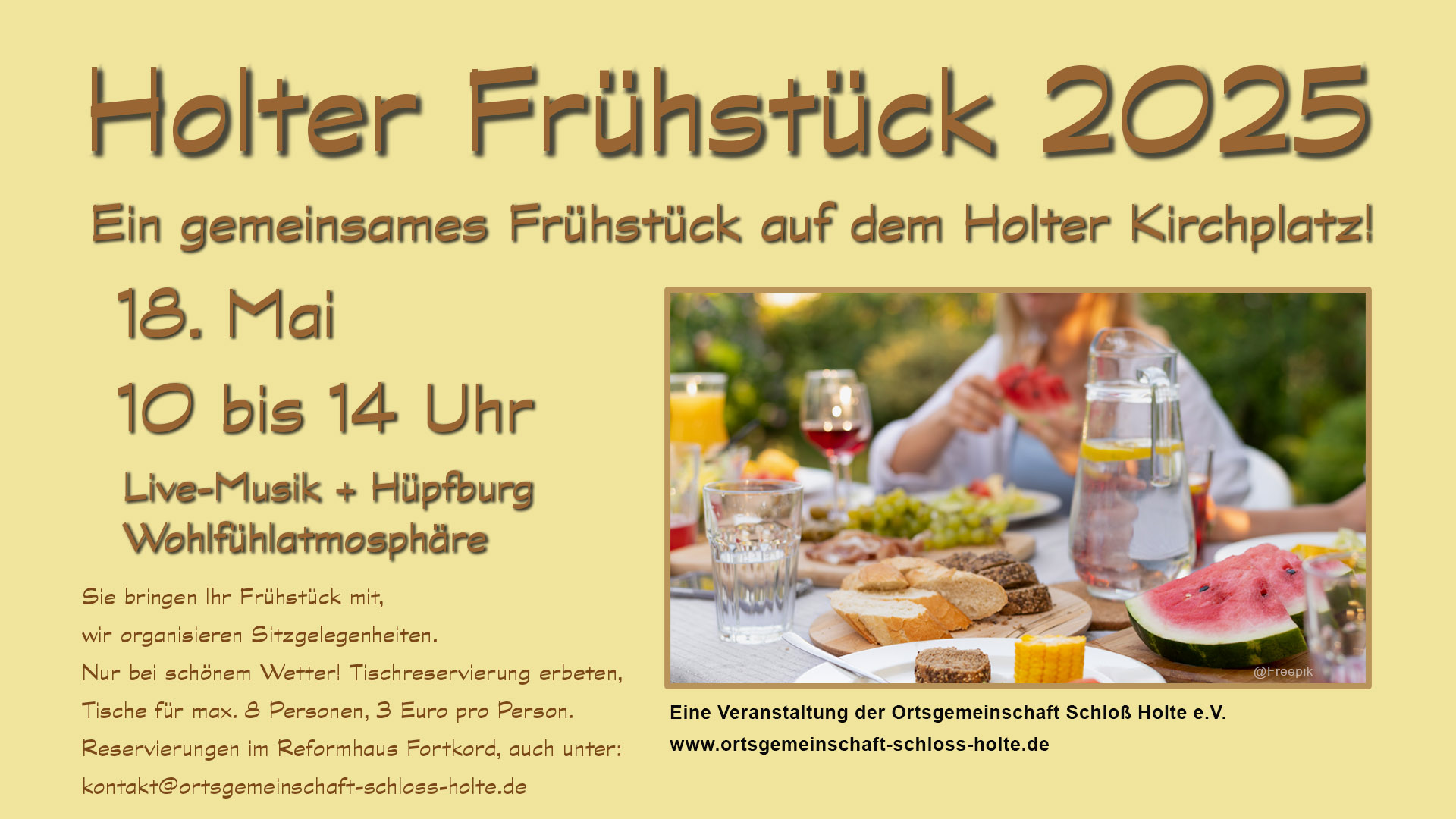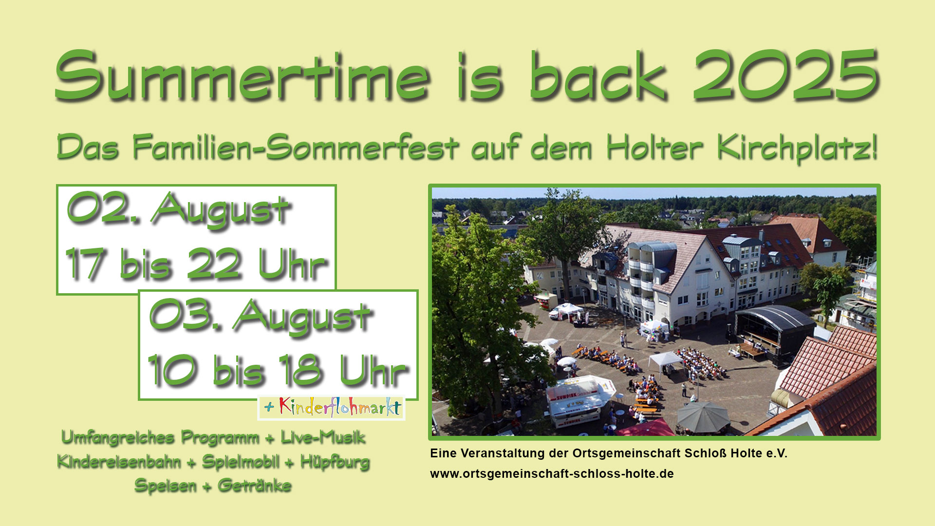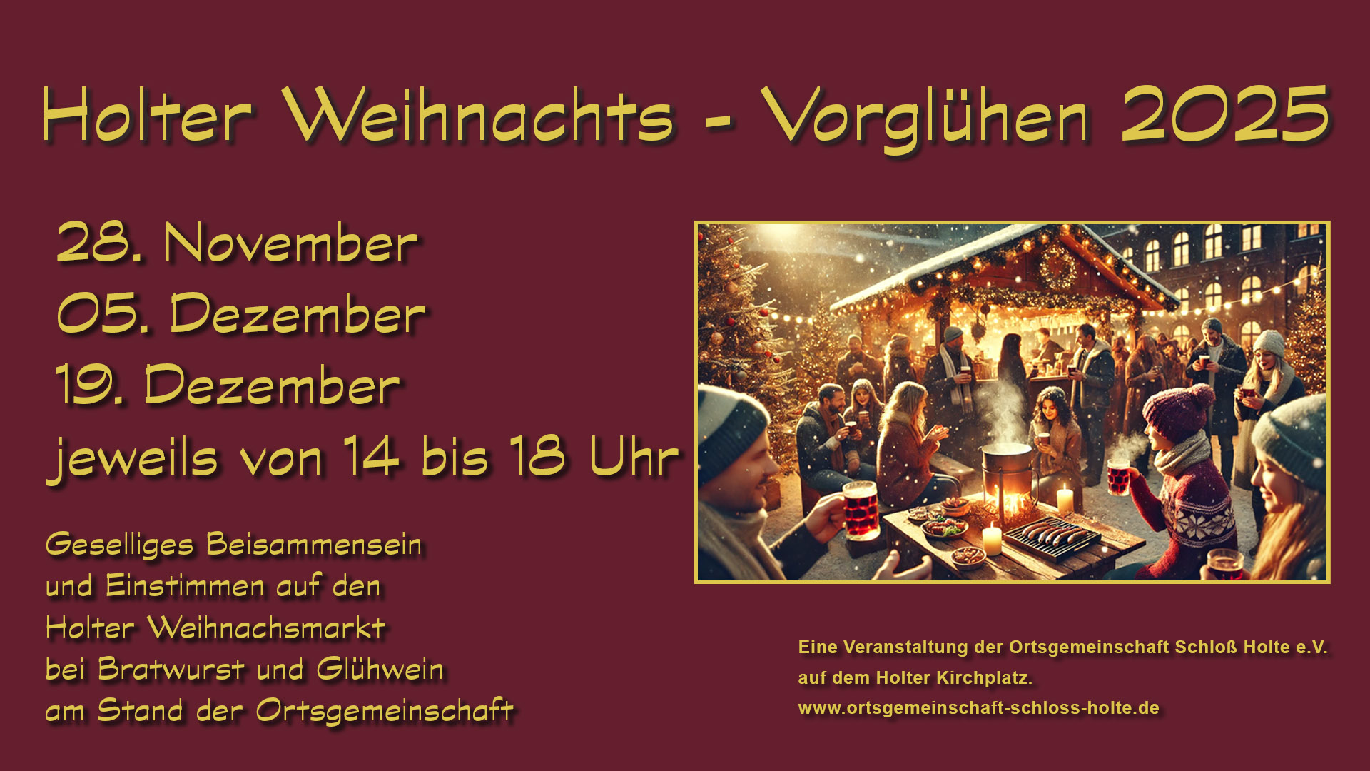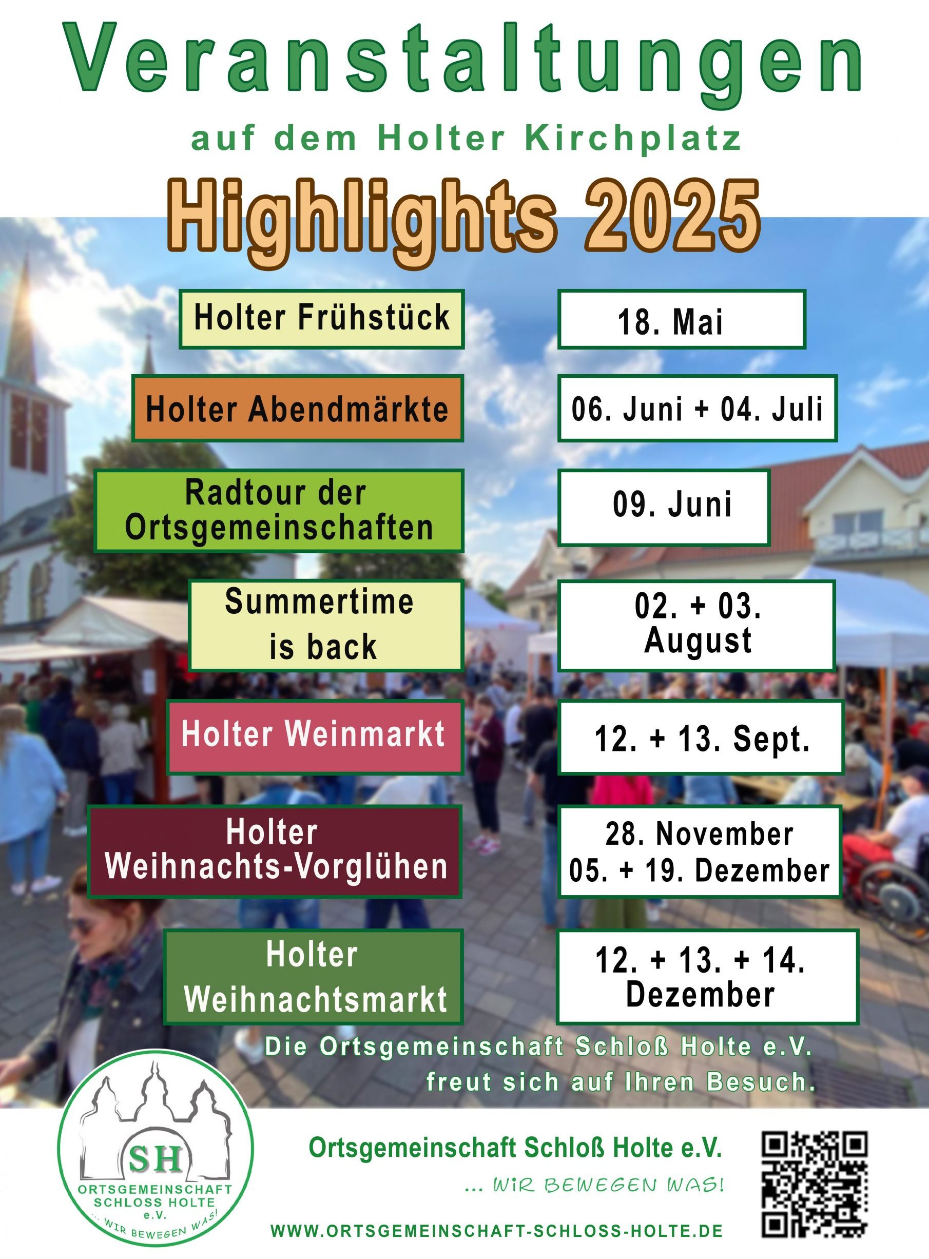Die Ortsgemeinschaft Schloß Holte e.V. veranstaltet jedes Jahr verschiedene Events auf dem Holter Kirchplatz im Ortszentrum. Hinter jedem dieser Ereignisse steckt ein engagiertes Team von Ehrenamtlichen, das mit viel Sorgfalt plant, organisiert sowie den Auf- und Abbau übernimmt – und dafür einen großen Teil seiner Freizeit investiert.