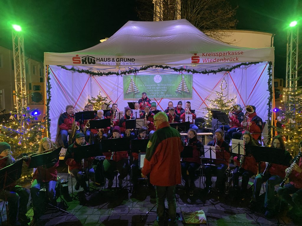 Der Weihnachtsmarkt startete am Freitagabend mit einer traditionellen Aktion: Kinder aus den Holter Kindergärten schmückten die Tannenbäume mit selbst gebasteltem Weihnachtsschmuck und sorgten damit gleich zu Beginn für eine festliche Stimmung. Musikalisch begleitet wurde die Eröffnung durch das städtische Blasorchester.