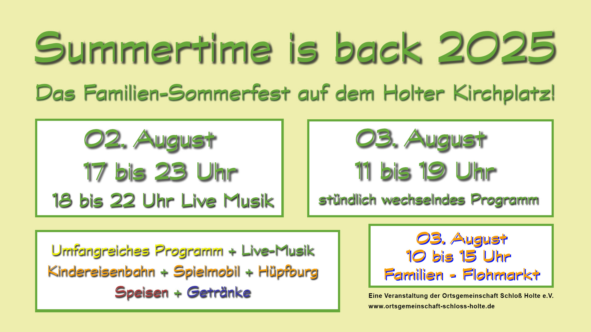 Nach dem großen Erfolg in den vergangenen Jahren kehrt das beliebte Sommerfest der Ortsgemeinschaft Schloß Holte e.V. auch 2025 zurück auf den Holter Kirchplatz. Unter dem Motto „Summertime is back“ erwartet Besucherinnen und Besucher am ersten Augustwochenende ein buntes und vielfältiges Programm für die ganze Familie. Die Veranstaltung findet am Samstag, den 2. August, und Sonntag, den 3. August 2025 statt und bietet Musik, Unterhaltung, Kinderaktionen, einen Flohmarkt und kulinarische Leckereien.